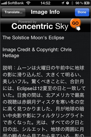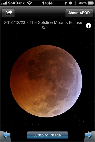 APODを見るためのビューワ。[ Jump to Image ] ボタンを押すと、好きな日付にジャンプしたり、ランダム表示をすることができます。一度見た画像は一時保存されるため素早く表示することができるようになります。UniversalアプリのためiPadの大画面で鑑賞できます。解説文表示に翻訳機能があって日本語に翻訳させて読むこともできます(翻訳結果はともかく)。検索機能は欲しいところかな。