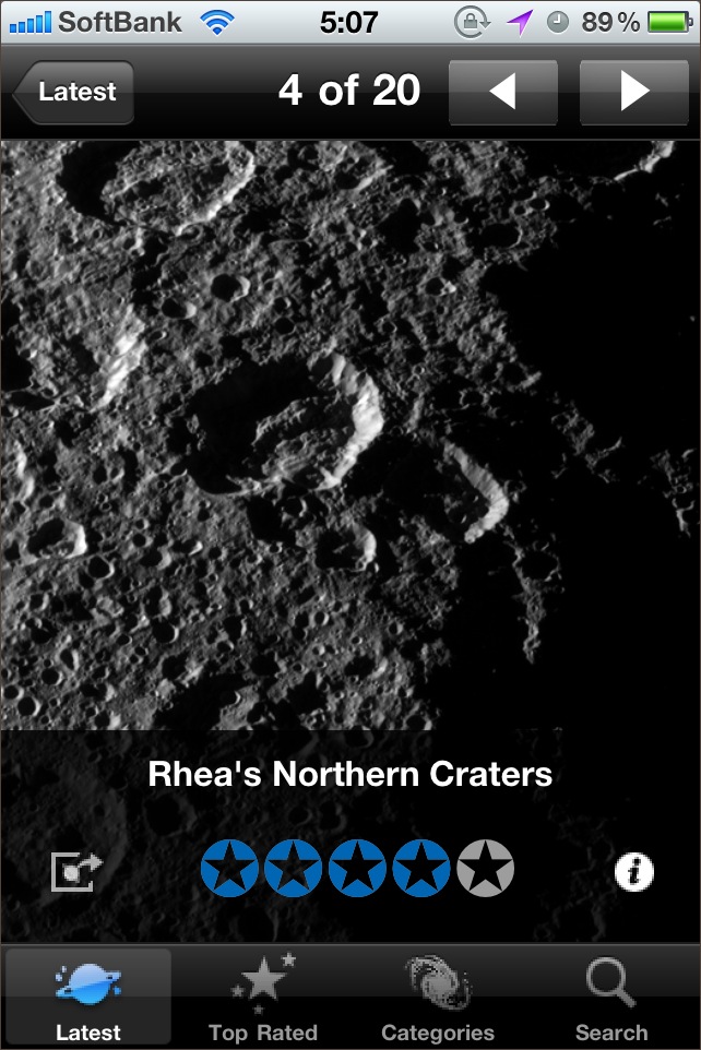 15年分の the Astronomy Picture of the Day、ハッブル宇宙望遠鏡の写真、全てのスペースシャトルのフライト、惑星探査機の写真、星雲/星団/星座の写真などなど...沢山の写真を見ることができるソフト。ただし、写真は、ウェブからダウンロードしてくるため最初の表示はかなり遅いです(なのでちょっと評価は厳し目)。逆に、購入後に写真が追加になることもある(と思われる)のがメリットではありますが...。アプリ内から写真を追加購入することも出来ます。