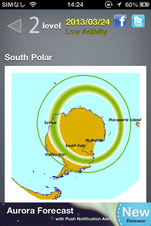 オーロラの現在の情報や予報を表示するソフト。太陽の活動状況もあります。情報が多すぎず、画面デザインも洗練されています。通知機能もありますが有料です。