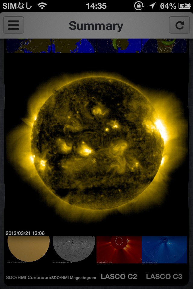 情報量がすごすぎる宇宙天気予報アプリ。初期の状態では4つ程度の画像が表示されるだけなので「 これだけかぁ... 」と思いきや、