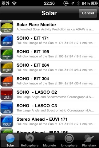 太陽観測衛星 SOHO からのリアルタイムの映像 ( 8種類 ) を表示するソフト。太陽面を様々な波長の光でとらえた写真を見ることができます。iPadに対応したUniversalアプリという以外は、これといった特徴があるわけではないですが、現在の太陽の映像を見るだけなら十分楽しめます。初心者にオススメでしょうか。