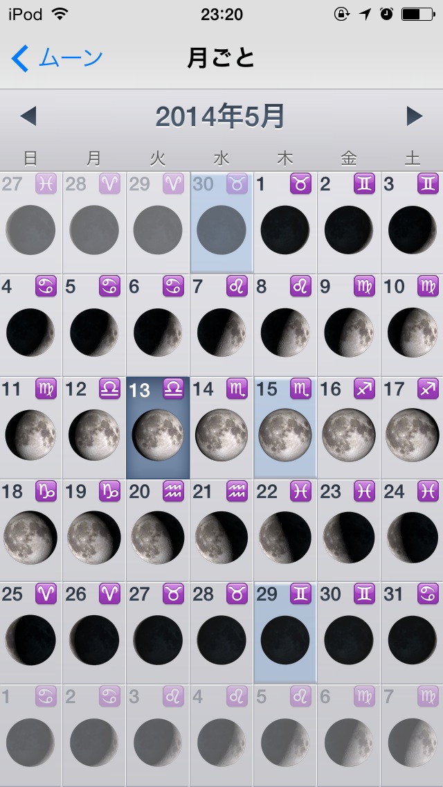 指定日の月の形や月齢カレンダーを表示するソフト。画面を横にスワイプすると前後の日に移動 ( 秤動も計算しているよう )。ピンチで拡大縮小。拡大時には月面の地名やアポロなどの着陸地点が表示されます。月食の日は「 Eclipse 」と表示されます。月の表示も綺麗でオススメ。