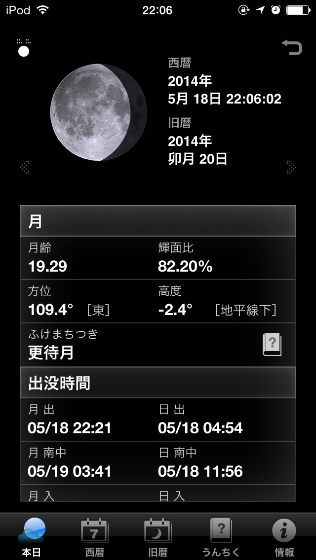 日の出/日の入/月の出/月の入の時刻表示、月の形、月齢カレンダー、月に関するうんちくなど、沢山の機能を詰め込んだアプリ。名前は月読君ですが、太陽の情報も扱っていますのでこちらに分類しています。